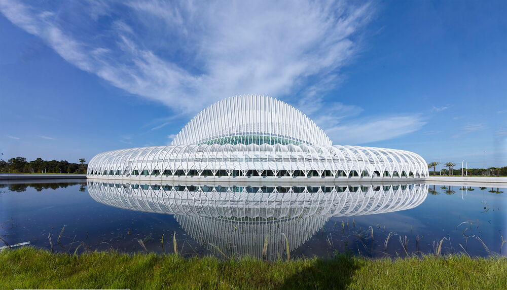 The architect’s unique brand of structural expressionism is also underpinned by an appreciation for environmental context as illustrated by the dynamic shell of the new Innovation, Science and Technology Building at Florida Polytechnic University. Situated in the subtropical climate of Central Florida, Calatrava’s winged structure includes an elegant skylight that incorporates a hydraulic shading system and is encircled by curved white pergolas that further reduce solar gain within the building.