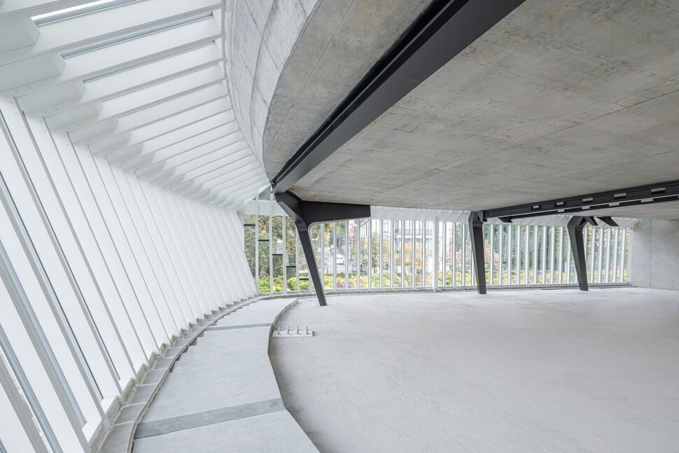 On Kreuzbühlstrasse, the eastern edge of the building introduces a small forecourt lined with greenery, offering views toward Zurich’s Grossmünster towers. One of the project’s most ambitious components lies beneath the surface. Responding to the City of Zurich’s initiative to reorganize bicycle traffic, Spanish-Swiss architect Santiago Calatrava integrated an underground bicycle station with capacity for more than 800 bikes. The three-level facility frees Stadelhofer Platz from open-air parking, returning its surface to pedestrians and urban greenery. Building this structure in the tight, waterlogged site presented major technical challenges, ultimately resolved through an intricate foundation system and waterproofing strategy. Now complete, the subterranean complex stands as a critical piece of Zurich’s sustainable mobility network.