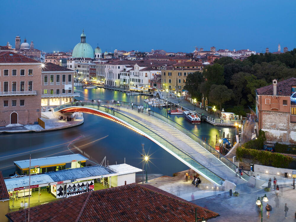 Most of the architect’s bridges are conceived as architectural centerpieces, but Calatrava can also apply a more subtle touch when approaching the challenge of combining modern design with a historic context. For the Ponte della Costituzione (Constitution Bridge) spanning the Grand Canal in Venice, Italy, the architect pared back his theatrical style — resulting in a pedestrian footway defined by transparency, reflection, and light.