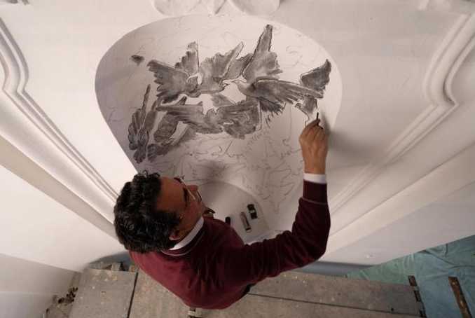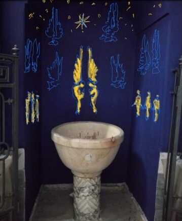 Regista impegnato a dirigere gli interpreti del suo film e, insieme, abile attore, Calatrava ha dipinto le pareti e il soffitto con un intenso blu oltremare costellato di stelle dorate, evidenziando così gli elementi strutturali della cappella, in modo da conferire un’inattesa profondità all’architettura settecentesca. Poi, ha ripreso alcuni motivi tradizionali dell’iconografia religiosa. Ha riempito le nicchie di vasi di porcellana in forma di uccelli, fiori, rami e foglie; sistemato vasi vagamente picassiani sugli altari; collocato i portacandele, gli angeli e le colombe nella nicchia che ospita il battistero con la fonte battesimale; sospeso dal soffitto un uovo in ceramica. Inoltre, ha curato i preziosi paramenti di seta che coprano l’altare. Ed è intervenuto sulle vetrate (dipinte a mano, con la tecnica della cucitura a piombo).